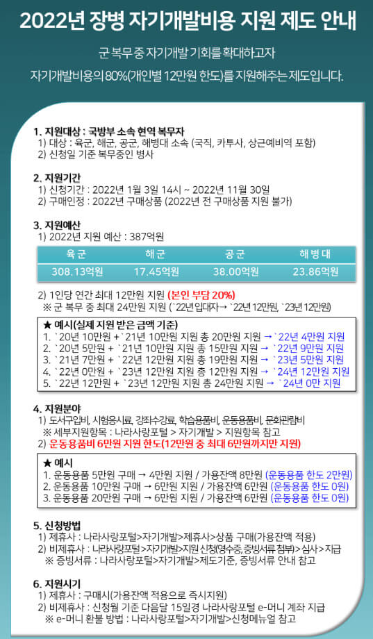 군 복무중인 장병이라면 누구나 알고 있을만한 "병 자기개발비용 지원제도" 국방부에서는 병사들의 자기개발 기회 확대 및 전역 후 취업 준비 여건 보장을 위하여 2019년 부터 도입된 사업입니다. 이러한 혜택들은 2022년 기준 연 12만원 한도로 제공되며 대상 분야로는 어학시험 응시료, 도서 구매비, 온라인 강의 수강료와 더불어 운동용품 구매의 지원을 올해 승인이되었습니다.